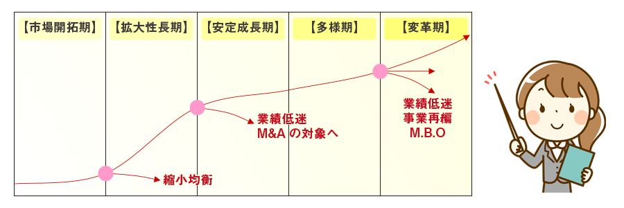 「企業(会社)」であれ「事業」であれ、発展・拡大する際には、【立ち上げ・市場開拓期】【拡大成長・シェア獲得期】【安定成長・シェア維持期】【戦略発展・多様期】【再構築・変革期】の「5つの段階」に分けて捉えることができます。それぞれの期にどのようなリーダーシップを発揮することで、組織を活性化していくのか、ケースを用いて学習します。