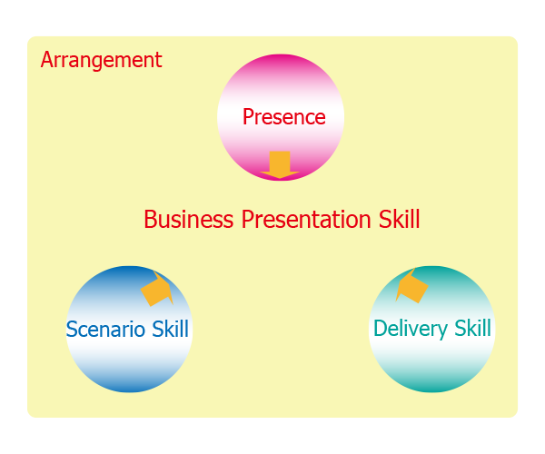 プレゼンテーションスキルをArrangement(事前調査・準備)、Presence(姿勢・態度・存在感)、Scenario Skill(構成・組み立て・コンテンツ)、Delivery Skill(話し方・動作・ツール)の4つの要素に分解し、それぞれの要素についてワークショップを通じて学習します。