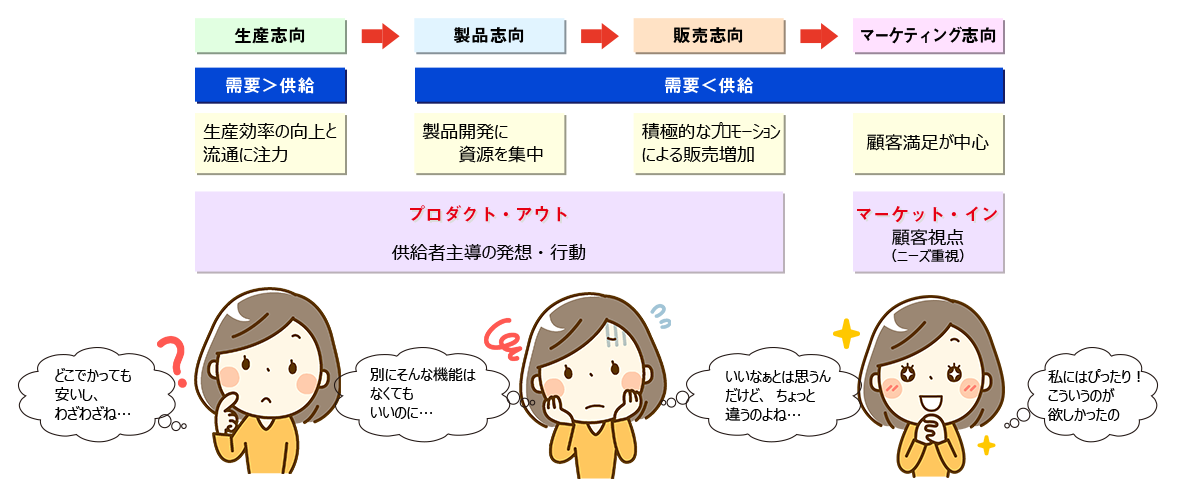 これまでのプロダクト・アウト(供給者主導の発想・行動)の発想では、消費者・ユーザーは製品・サービスを購買・導入しなくなっており、消費者・ユーザーの「顧客価値」「顧客満足」を中心にマーケティングを考える「マーケット・イン」の発想や行動が不可欠になってきています。