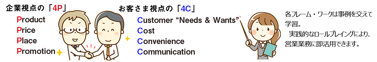 「マーケティング研修」では、顧客や顧客を取り巻く環境の理解を深めるための【環境分析】、顧客接点の強化を図るための【マーケティング・ミックス(4P・4C)】を学習し、一連の営業プロセスを確認。そして実践に向け、ロールプレイングを行うことにより、マーケット・イン発想の営業を実現します。